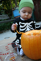 H experienced his first Halloween today and although he will not remember it, we had lots of fun. The day started with a Halloween hike up in Tilden. H was planning to wear his skeleton costume but peed in it before we had a chance to hit the trail. Then we spent the afternoon moving around and playing (and doing laundry) while Daddy worked at the office. (H is really moving around these days. Imagine a large inchworm...) Then after we picked up Daddy at work we got down to the real Halloween fun. H got to "carve" his first pumpkin this evening. It was a lot of fun to watch him squeezing the guts and trying to eat everything in sight.Seeing how much fun we were having, our neighbor came out to say hello and offered us the rare treat of taking a family photo.